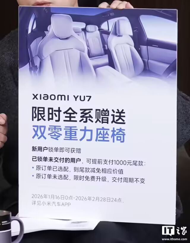 (2)2月28日前下定小米YU7,全系送双零重力座椅。锁单未交付用户,提前付1000元尾款可享:已选配双零重力座椅的用户,尾款减免相应价值;若未选配,可限时免费升级,交付周期不变。