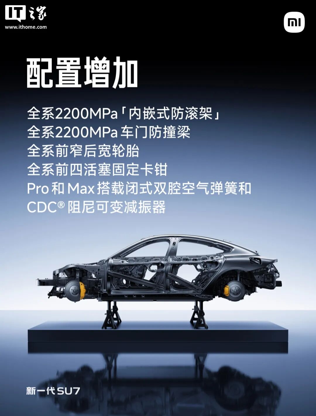 (5)白车身、底盘等方面做了大幅度增配:全系2200MPa“内嵌式防滚架”和车门防撞梁;全系前窄后宽轮胎;全系前四活塞固定卡钳;Pro和Max版本搭载闭式双腔空气弹簧和CDC阻尼可变减振器,提升了安全性、舒适性和操控品质。