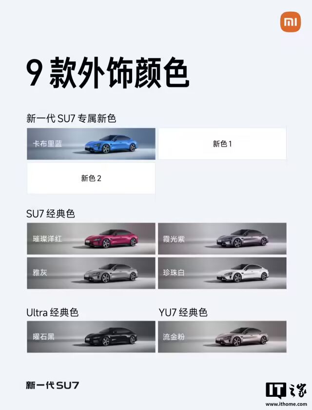 (1)九款外饰颜色:保留上一代SU7经典色:霞光紫、雅灰、璀璨洋红、珍珠白。引入YU7和Ultra上备受好评的颜色:曜石黑、流金粉,还有三款全新的专属颜色,除了已经公布的卡布里蓝,还有另外两款,之后再和大家慢慢分享。