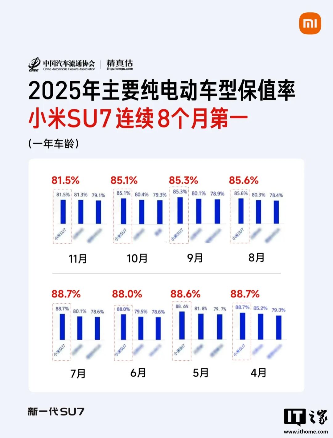 (3)根据中国汽车流通协会和精真估的最近数据显示,2025年小米SU7连续8个月都是纯电动车型保值率(一年车龄)的第一名,12月的保值率达80.1%。
